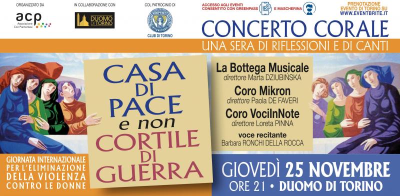 Un progetto di Associazione Cori Piemontesi fortemente voluto per la giornata internazionale per l'eliminazione della violenza contro le donne: giovedì 25 novembre alle ore 21, presso il Duomo di Torino si svolgerà il concerto corale “Casa di Pace e non Cortile di Guerra”. Una serata di riflessioni e di canti con “La Bottega Musicale” diretta da Mata Dziubinska, il Coro Mikron diretto da Paola De Faveri, il Coro VociInNote diretto da Loreta Pinna. Voce recitante, Barbara Rochi della Rocca. Tre cori femminili, tre maestri donna, una voce recitante donna.