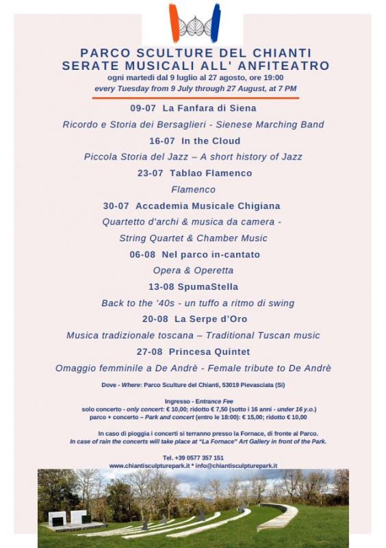 Decima edizione delle “Serate Musicali all'Anfiteatro” al Parco Sculture del Chianti a Pievasciata, circa 10 km a nord di Siena con un nuovo programma vario e coinvolgente, che spazia dal flamenco alla musica classica, dalla musica tradizionale toscana al jazz.