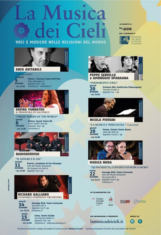 Giunge nel 2018 alla sua 22^ edizione “La Musica dei Cieli – Voci e musiche nelle religioni del mondo”, la rassegna è uno degli appuntamenti più apprezzati del periodo natalizio ed è aperta alla tradizione musicale delle diverse religioni del mondo e alle sue contaminazioni alla ricerca di una comune tensione spirituale.