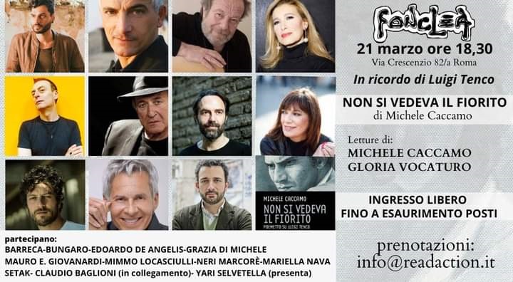 Un poemetto di Michele Caccamo, "Non si vedeva il fiorito" (Castelvecchi Editore), diventa un’occasione per omaggiare Luigi Tenco, 21 marzo 2023 dalle ore 18.30, nel giorno del compleanno del cantautore ligure, al Fonclea di Roma. Sarà un’eccezionale serata di musica e poesia con molti artisti: Bungaro, Neri Marcorè, Grazia Di Michele, Mimmo Locasciulli, Setak, Mariella Nava, Edoardo De Angelis e, tra questi big, anche il cantautore calabrese Barreca, finalista qualche settimana fa al prestigioso Premio De Andrè. Interverrà in collegamento anche Claudio Baglioni.