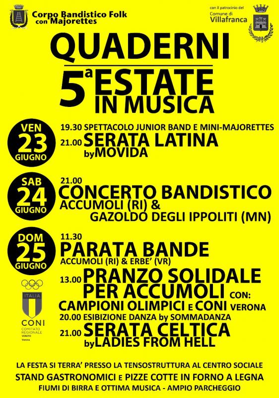 Domenica 25 giugno11:30 Parata bande, copro bandistico di Accumoli (RI) & Erbè (VR)13:00 pranzo solidale per Accumoli con campioni olimpici e Coni di Verona