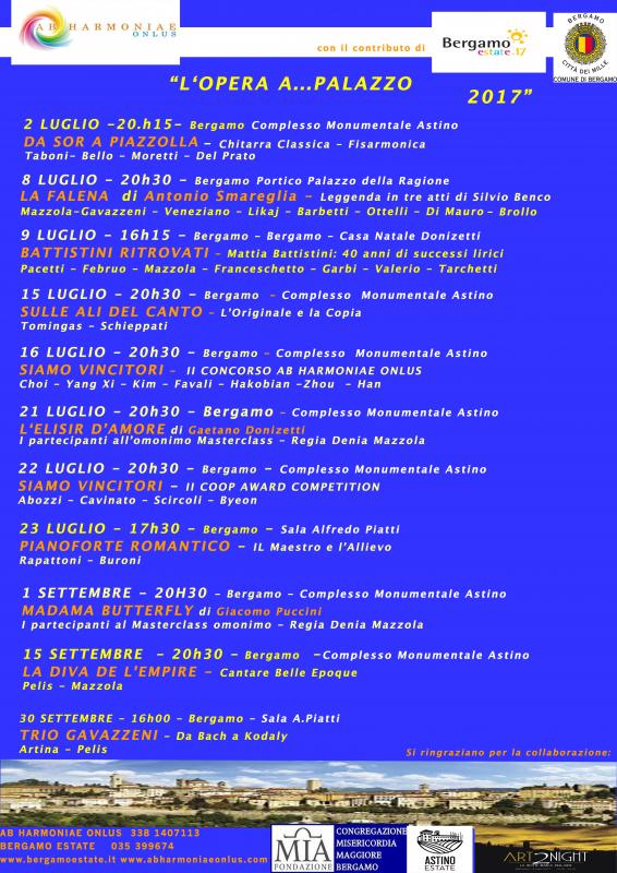 Con il progetto “l’Opera a Palazzo” - rassegna musicale creata per Bergamo nel 2010, Denia Mazzola Gavazzeni colloca, anche quest’anno, la sua attività culturale associativa nel grande palinsesto di Bergamo Estate 2017.