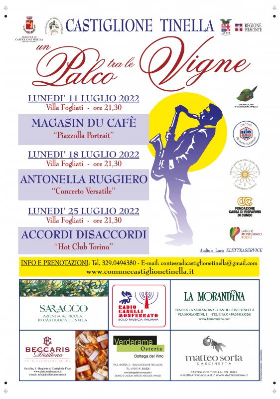 Lunedì 11 luglio a Villa Fogliati di Castiglione Tinella si apre il sipario sulla rassegna musicale “Un Palco tra le Vigne”, appuntamento con la grande musica sempre atteso dai tanti appassionati che ha dovuto fermarsi per due anni a causa della pandemia. Ora però si riparte, e il ciclo di concerti si apre con un imperdibile spettacolo di musica del seguitissimo gruppo “Magasin du Cafè”, che a Castiglione porta sul palco il progetto “Piazzolla Portrait”: un omaggio al grande Astor Piazzolla secondo l’interpretazione di questa interessante formazione composta da Denny Bertone alla chitarra, Davide Borra alla fisarmonica e tastiere, Mattia Floris chitarra e voce, Alberto Santoru al contrabbasso e percussioni e la grande Sara Cesano al violino. Il pubblico potrà apprezzare le originali sonorità della band, che sta costruendo un grande lavoro musicale anche sulla world music di cui offriranno un “assaggio” nella serata castiglionese.