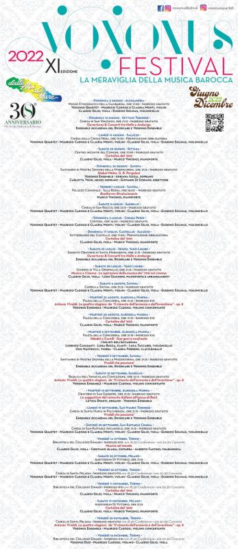 Il programma di venerdì 28 ottobre ruota attorno al prestigioso Voxonus Quartet, nato all’interno del più vasto progetto Voxonus Academia di Musici e Cantori, un complesso con organico variabile composto da cantanti e strumentisti specializzati nel repertorio settecentesco e ottocentesco che ha collaborato, tra gli altri, con l'Orchestra Rai. Il Voxonus Quartet si occupa del periodo barocco e tardo barocco. Particolare attenzione è posta infatti alle scritture di transizione, dunque il quartetto si avvale di strumenti con montatura classica, corde di budello, accordatura a 430 Hz, in grado di esaltare al massimo la scrittura barocca. Il Voxonus Quartet è l'anima del Cerqui, il Centro di Ricerca sul Quartetto Italiano, nato in seno all’Orchestra Sinfonica di Savona, che collabora con studiosi di tutta Italia.