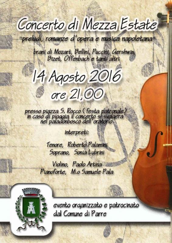 Domenica 14 agosto Parre risuonerà delle arie del 3° CONCERTO DI MEZZA ESTATE, con le voci del tenore Roberto Palamini e del soprano Sonia Lubrini che, accompagnati da violino e pianoforte eseguiranno brani spaziando nella storia della musica, tra preludi, romanze d’opera fino alla musica napoletana. Una serata in compagnia della buona musica di Mozart, Bellini, Puccini, Gershwin, Bizet, Offenbach e tanti altri nella suggestiva Piazza San Rocco (in caso di pioggia nella PalaDonBosco dell’oratorio).