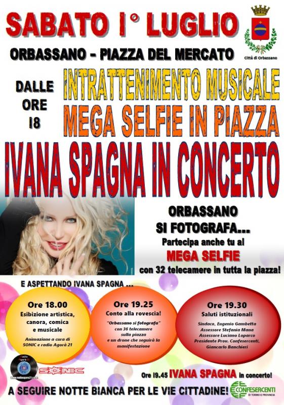 A partire dalle ore 18, in piazza del Mercato, intrattenimento musicale, mega selfie con 32 macchine fotografiche che inquadreranno l'intera piazza e, per finire, grande concerto di Ivana Spagna (Partecipazione gratuita).