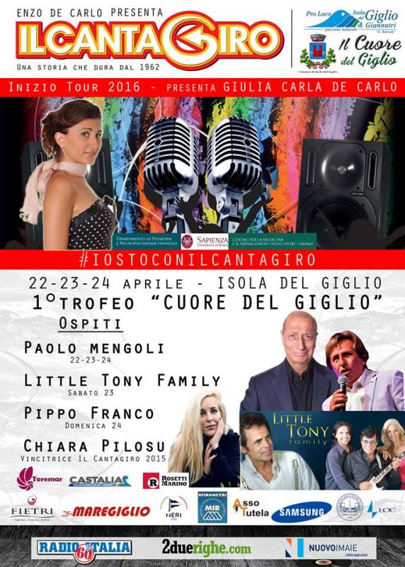Prende il via il 22 aprile prossimo all'Isola del Giglio la prima tappa de Il Cantagiro Tour, una delle più note "maratone musicali" di tutti i tempi. Patrocinata dal Comune di Isola del Giglio e dalla Pro Loco dell’Isola del Giglio e Giannutri e realizzata anche grazie all’intervento di numerosi e prestigiosi sponsor, la manifestazione punta a scoprire giovani talenti e a lanciare lavori inediti attraverso una valutazione lunga e accurata effettuata da una giuria d’eccezione.