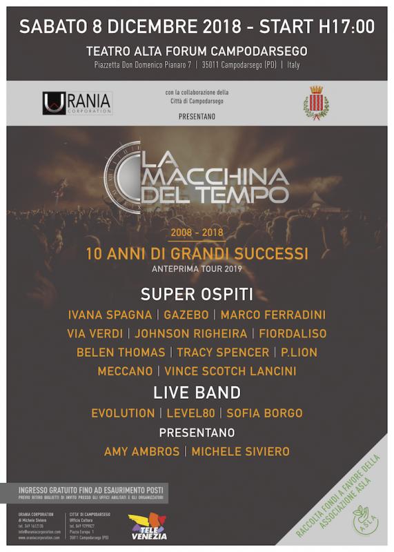 Ed è per i grandi risultati e l’enorme affetto dimostrato in questi anni da spettatori, artisti e addetti ai lavori che, sabato 8 dicembre al Teatro Alta Forum di Campodarsego (PD), per festeggiare questo importante avvenimento, la nuova stagione artistica dell’agenzia si aprirà con l’anteprima Live del TOUR 2019 de la Macchina del Tempo, spettacolo che si sviluppa in più tappe nelle migliori location italiane e straniere, dove si esibiscono ogni anno innumerevoli artisti che hanno segnato la storia della musica dagli anni 70 ad oggi.