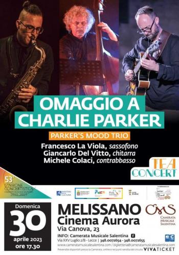 Nuovo appuntamento con i “Tea Concert” della Camerata Musicale Salentina, realizzati in collaborazione con l'Associazione Musicale Junior Band APS nell'ambito della 53^ Stagione Concertistica 2022-23. Domenica 30 aprile alle 17,30 al Cinema Aurora di Melissano (LE) si esibirà il Parker's Mood Trio, composto da Francesco La Viola al saxofono, Giancarlo Del Vitto alla chitarra e Michele Colaci al contrabbasso. Tè e biscotti per tutti, da gustare insieme all'ascolto del concerto, che sarà un omaggio a Charlie Parker, straordinario sassofonista e compositore statunitense di musica jazz.