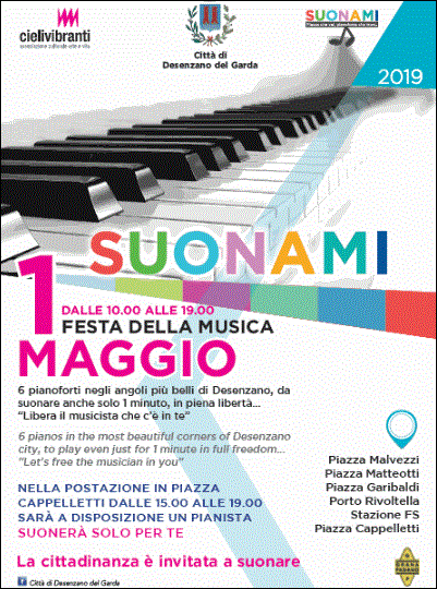Sei pianoforti verranno posizionati negli angoli più belli di Desenzano, al Castello, nelle Piazze Malvezzi e Matteotti, al Parco del Laghetto, al Parco Idroscalo ed al Porto di Rivoltella e saranno messi a disposizione di principianti, dilettanti e professionisti: tutti potranno suonare, anche solo un minuto, in piena libertà!