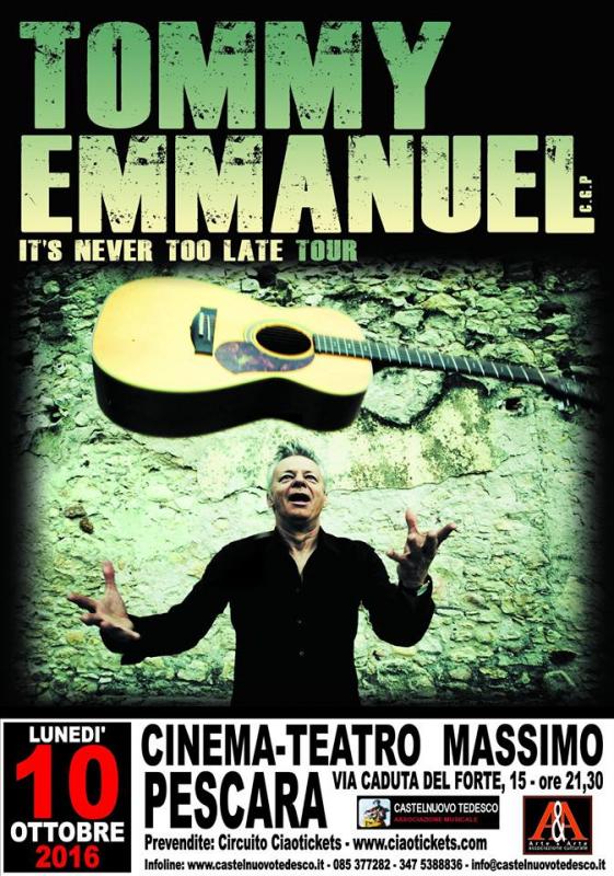 Tommy Emmanuel (Australia), ritenuto unanimemente il massimo esponente della chitarra acustica a livello mondiale, ridisegnando e sconvolgendo uno stile chitarristico che, proprio grazie alle sue straordinarie performance live, ha cominciato ad appassionare ed emozionare non solo i musicisti ma la gente comune che torna ai suoi show in maniera sempre più consistente, Tommy è esecutore e compositore di gran parte dei brani che compongono il suo brillante repertorio e fin dagli inizi viene fortemente influenzato da due grandissimi artisti: Chet Atkins ed Hank Marvin. Tra i suoi riconoscimenti spiccano una nomination al Grammy Award nel 1998 con Chet Atkins per il CD The Day Fingerpickers took over the world e la vittoria del Nammy (Nashville Music Award) nel 1997, oltre ad essere stato insignito della medaglia dell’Order of Australia per i riconoscimenti conseguiti nella musica e nello spettacolo come chitarrista e per il suo contributo nel sociale come sostenitore di Kids Under Cover, un'associazione che si occupa di costruire case e scuole per i giovani senza tetto. Un talento unico unito a un impatto scenico ed emozionale che trascende il lato puramente tecnico, fanno sì che i suoi interminabili tour per il mondo siano diventati un evento imperdibile e l'unico modo per poter catturare tutta l'energia e la magia che questo chitarrista sprigiona.