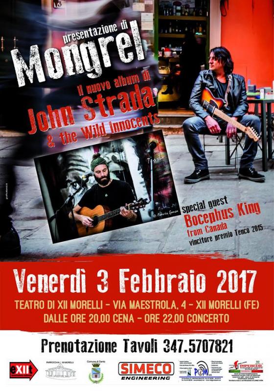 Il 3 Febbraio al Teatro di XII Morelli (frazione del Comune di Cento) sarà presentato Mongrel il 7° CD di John Strada, il primo cantato in inglese, considerato da varie testate della stampa specializzata uno dei migliori CD del 2016.