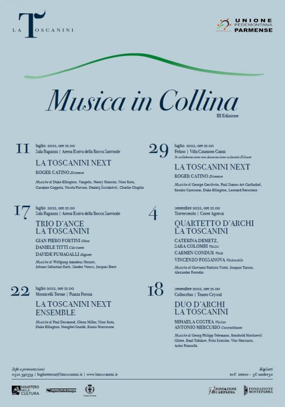 «La rassegna “Musica in Collina”, giunta quest’anno alla terza edizione, è cresciuta fino a diventare un elemento irrinunciabile della programmazione estiva de La Toscanini – afferma Alberto Triola, Sovrintendente e Direttore Artistico de La Toscanini –. La fondamentale collaborazione con l’Unione Pedemontana Parmense ci consente di dedicare un importante progetto musicale al territorio, e di dare la possibilità a moltissime persone di godere dell’esperienza dell’ascolto dal vivo di esecuzioni di qualità, grazie ai professori d’orchestra de La Toscanini e ai giovani talenti de La Toscanini Next».