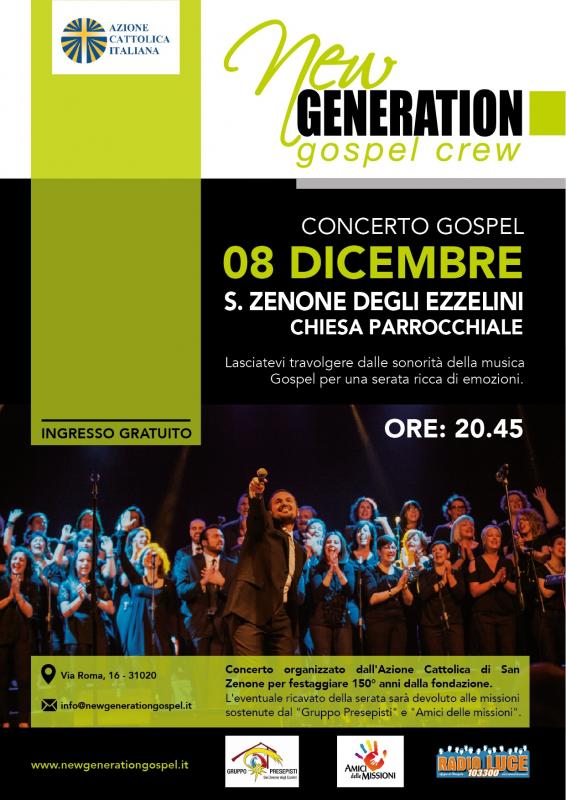I New Generation Gospel Crew tornano in concerto per incantare il loro pubblico con una serata a dir poco esplosiva, all’insegna delle trascinanti sonorità della musica gospel. L’appuntamento è a San Zenone degli Ezzelini, alle ore 20.45 di venerdì 8 dicembre 2017, presso la Chiesa Parrocchiale. Il concerto è organizzato dall’Azione Cattolica di San Zenone, in collaborazione con il Gruppo Presepisti, gli Amici delle Missioni e Radio Luce, per festeggiare il 150° anno dalla fondazione dell’Azione Cattolica. L’eventuale ricavato della serata sarà devoluto alle missioni sostenute dal Gruppo Presepisti e dagli Amici delle Missioni. I New Generation tornano a calcare le scene più che mai carichi di entusiasmo e di energia e secondo il loro ormai ben noto stile, si esibiscono in uno spettacolo ricco di emozioni e di sorprese. Si propongono infatti con un repertorio completamente rinnovato, senza tralasciare qualche puntata ai loro grandi classici.