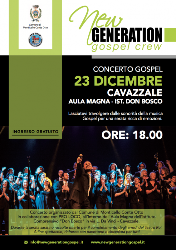 I New Generation Gospel Crew, nel pieno dello svolgimento del loro tour invernale, arrivano a Cavazzale più carichi che mai di entusiasmo ed energia per incantare il loro pubblico con un eccezionale concerto di grande gospel! Un appuntamento imperdibile domenica 23 Dicembre alle 18,00, presso l’Aula Magna dell’Istituto Comprensivo Don Bosco, via Leonardo da Vinci – Cavazzale.