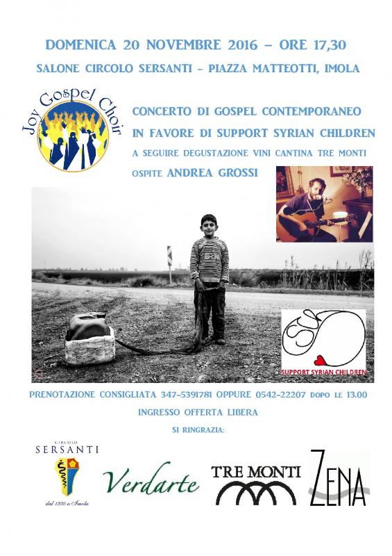 Sarà con noi anche l'amico cantautore Andrea Grossi.Il ricavato andrà all'associazione Support Syrian Children che assiste bambini e popolazioni in serie necessità. Ogni piccolo aiuto può fare veramente la differenza per un bambino in un campo profughi! Ingresso ad offerta libera. Prenotazione consigliata: 347-5391781 oppure 0542-22207 dopo le 13.00
