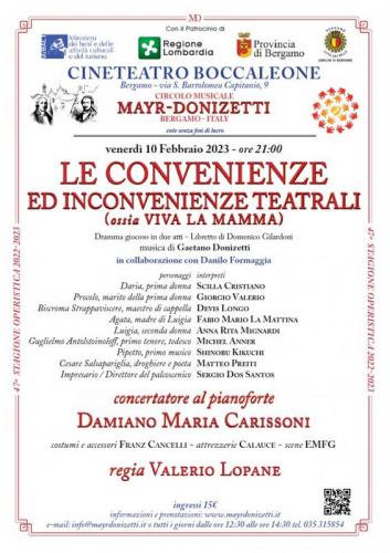 Siamo fieri di poter presentare per la prima volta nella storia del Circolo Le convenienze ed inconvenienze teatrali. Il nostro musicista alla fine degli anni Venti dell’800, dopo una durissima gavetta, durata una decina d’anni, stava emergendo, ritagliandosi un ruolo di crescente rilevanza. Quasi a significare l’acquisizione di maggiore consapevolezza si colloca questa divertentissima farsa (prima in un atto e poi ampliata a due) che, con pungente sarcasmo, mette a nudo i pregi (pochi e meschinelli) ed i difetti (dai tratti comicamente caricaturali) del teatro lirico ottocentesco; difetti che, nella lungimiranza donizettiana, non sono nient’altro che quelli di oggi e risultano per questo tanto comici. Le vivaci vicende della narrazione sono frutto, oltre che della fantasia del librettista, anche di Donizetti stesso, che collaborò ampiamente alla stesura del testo. Con la sua vena ironica e dissacratoria avrà il coraggio di prendersi gioco anche del compositore di riferimento dell’epoca, Gioachino Rossini, in una delle sue pagine allora più note, soprattutto a Napoli, dove l’opera ebbe la sua trionfale prima: La canzone del salice del rossiniano Otello, il moro di Venezia. La celeberrima Assisa a piè di un salice, diviene, nel canto sgangherato di Mamma Agata, Assisa a’ piè d’un sacco. Tutta donizettiana è anche l’idea di affidare questa figura femminile (motrice della vicenda), ad un basso buffo. Gli effetti sono esilaranti. Tra le pagine più note, oltre all’aria Mascalzoni sfaccendati e alla parodia della citata Canzone del Salice proposte da Mamma Agata, si annovera anche il duetto con la prima donna Ch’io canti un duetto.