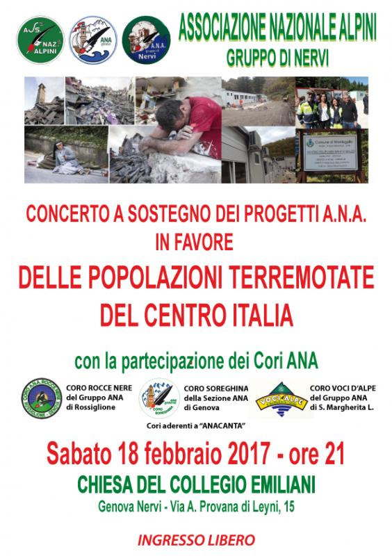 Il Gruppo A.N.A. di Nervi e i Cori della Sezione di Genova, appartenenti a ANACANTA, hanno risposto all'appello del Presidente Nazionale dell'A.N.A. e daranno vita ad un'iniziativa per contribuire alla racccolta dei fondi per la realizzazione del progetto in aiuto di questi nostri fratelli così tremendamente colpiti. Ecco quindi il Concerto di cori alpini.