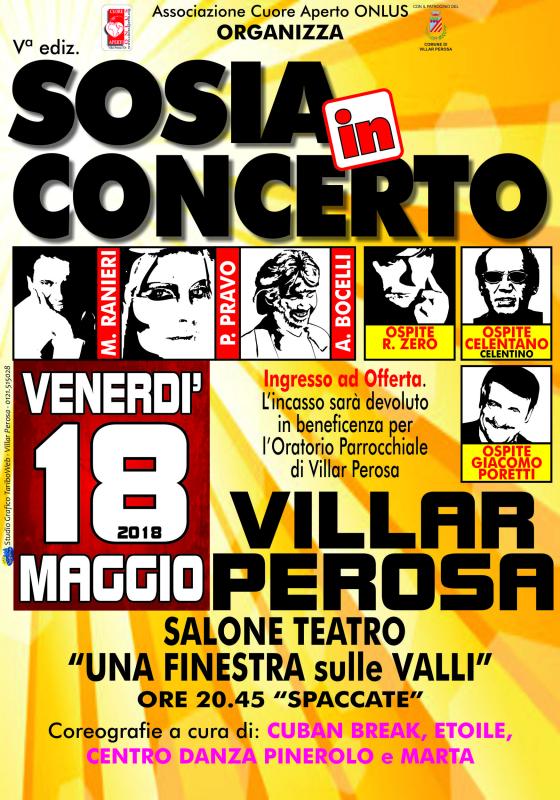 Torna per il quinto anno consecutivo alla Finestra sulle Valli di Villar Perosa alle ore 20,45, Venerdì 18 Maggio, il concerto dei SOSIA organizzato dall’associazione Cuore Aperto Onlus. Saliranno quest’anno i sosia di Andrea Bocelli, Patty Pravo, Massimo Ranieri. Ospiti Renato Zero, Celentino e Giacomo Poretto. Provenienti da ogni parte d’Italia si esibiranno con le loro canzoni più celebri.