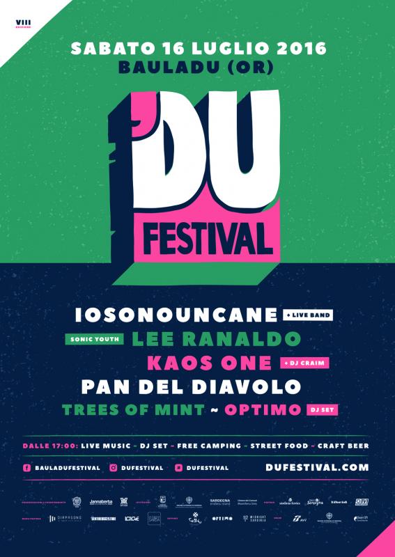 A dominare in cartellone l'unica e attesissima data in Sardegna di Lee Ranaldo, storico chitarrista e fondatore dei Sonic Youth, headliner insieme a Iosonouncane, Kaos One e Il Pan Del Diavolo, preceduti dal live set del solista Trees Of Mint e seguiti dall'esplosivo aftershow di Optimo Party, non un semplice DJ set, ma una vera e propria festa colorata disco, per completare in bellezza il mosaico di sonorità e atmosfere che da sempre caratterizza il 'DU Festival.