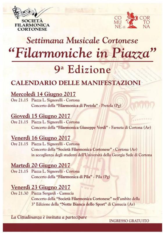 La 9^ edizione di Filarmoniche in Piazza si svolge a Cortona (AR) il 14, 15, 16, 20, 23 giugno 2017.