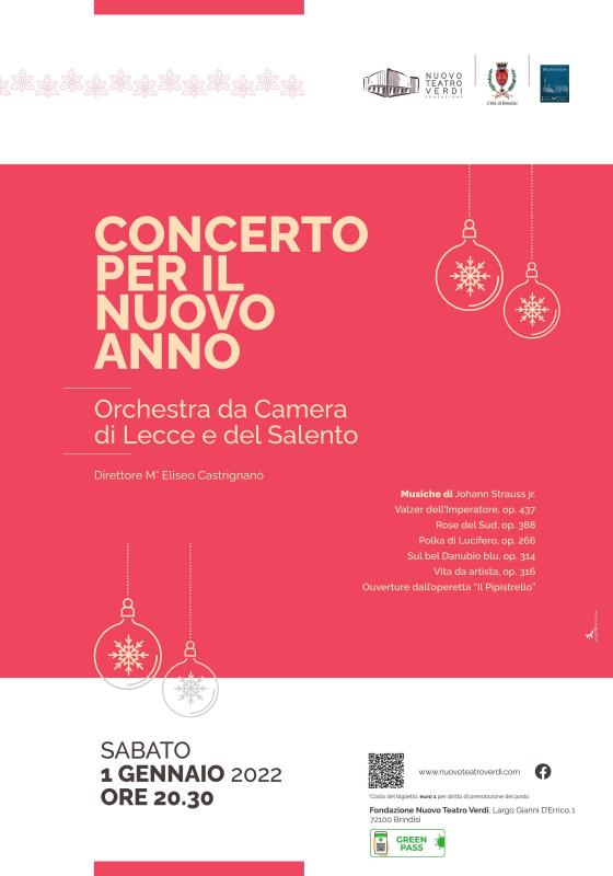 Un augurio musicale per il 2022. Si rinnova l’appuntamento con il tradizionale «Concerto per il Nuovo Anno», in programma sabato 1 gennaio 2022 nel Nuovo Teatro Verdi alle ore 20.30. Protagonista l’Orchestra da Camera di Lecce e del Salento, diretta dal M° Eliseo Castrignanò e costituita da professori con esperienza ultradecennale provenienti da diverse formazioni.