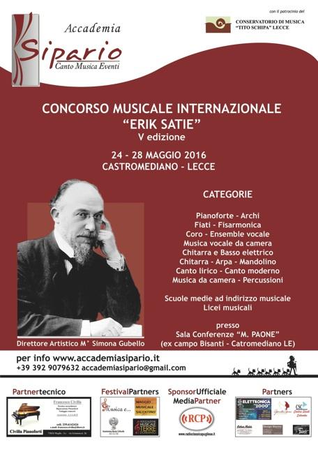 Sono Aperte le iscrizioni per la V edizione del Concorso Musicale Internazionale “Erik Satie” dal 24 al 28 Maggio presso Sala Congressi “Paoni” ex campo Bisanti a Catromediano - Lecce,