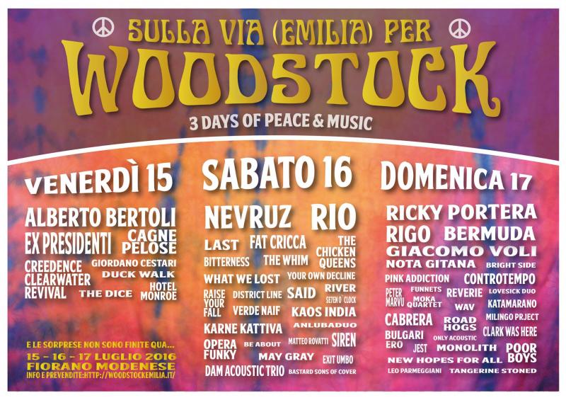 Partecipare a 'Sulla via (Emilia) per Woodstock 2016' significa riunirsi per ascoltare cantanti e band di ogni genere e calibro, dando ad artisti emergenti la possibilità di misurarsi con un vasto pubblico e salire sullo stesso palco di quei cantanti che ormai sono impressi nell'immaginario collettivo. Tutti avranno però qualcosa in comune: la provenienza. Da Piacenza a Rimini, sarà la VIA EMILIA il fattore comune.