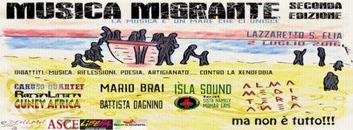 Si svolgerà nella giornata di sabato 2 luglio al Lazzaretto di Cagliari la seconda edizione del festival "Musica Migrante", manifestazione organizzata dalla band Almamediterranea, dedicata alla sensibilizzazione contro razzismo e xenofobia, a sostegno dell’integrazione di tutte le etnie e culture presenti nel territorio isolano, con particolare attenzione alle comunità straniere presenti nell’area urbana della città di Cagliari. L'intera giornata (apertura dei cancelli alle ore 10) sarà popolata da dibattiti, proiezioni di contributi, laboratori di arti e artigianato da tutto il mondo, tavole rotonde e concerti con alcuni tra i nomi più rappresentativi della scena regionale quali Claudia Aru, Almamediterranea, Isla Sound System + Momar Gaye e Sista Namely, Ruota Libera, Mario Brai, Caruso Quartet, Claudia Aru Quartet, Kike Quintana e Sixto Marquez da Cuba.