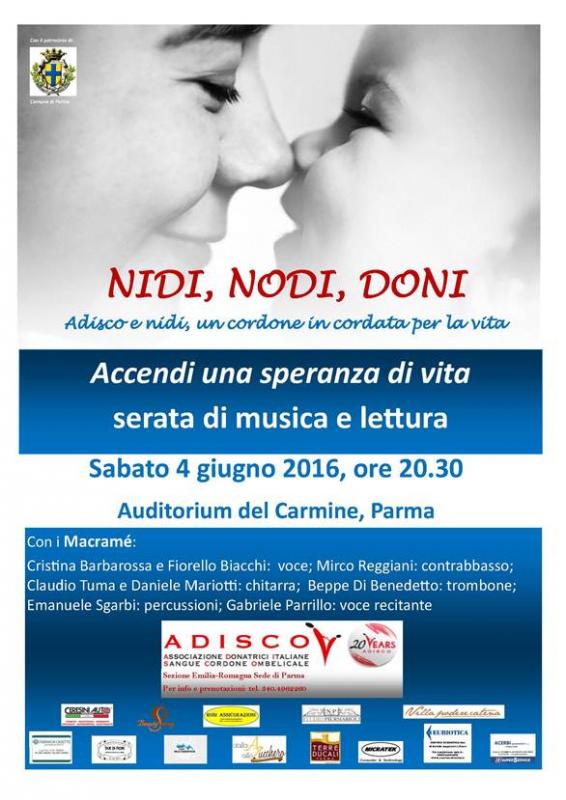 La Associazione Donatrici Italiane Sangue Cordone Ombelicale (ADISCO) Sezione Emilia Romagna, Sede di Parma, a conclusione di un percorso di sensibilizzazione sulla donazione del cordone ombelicale attuato in collaborazione con il Settore Nidi del Comune di Parma e rivolto ai genitori dei bambini iscritti ai Nidi propone una serata di musica e lettura per riflettere sull’importanza del dono del sangue del cordone ombelicale, dono inestimabile che, nel momento più bello per due genitori, la nascita del proprio figlio, può “accendere la speranza di un’altra vita”.