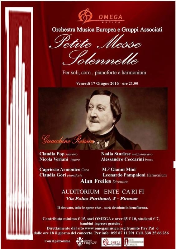 Ricominciò a comporre in quella che si considerava allora tarda età, e chiamò appunto le sue ultime composizioni, fra cui la Petite Messe solennelle, anche se da lui amata “peccati di vecchiaia”. Ad interpretare questo capolavoro di Rossini ci saranno i solisti: il soprano Claudia Pop, il mezzosoprano Nadia Sturlese, il tenore Nicola Veriani e il basso Alessandro Ceccarini. Il coro Capriccio Armonico del M.° Gianni Mini, al pianoforte Claudia Gori. A dirigere questo capolavoro di Rossini il M.° Alan Freiles. L’evento si svolgerà il 17 giugno 2016 alle ore 21.00 presso l’Auditorium dell’Ente Cassa di Risparmio di Firenze, via Folco Portinari 5.