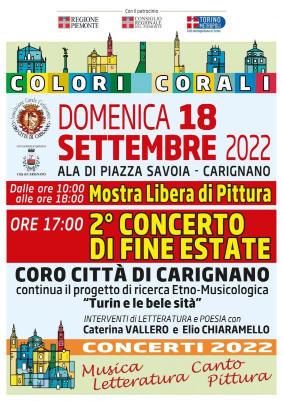 A distanza di un anno dal “Concerto della Rinascita”, che segnò la prima esibizione pubblica dopo i lunghi mesi della pandemia, l’Associazione Corale Carignanese APS e il Coro “Città di Carignano” ripropongono, sotto il nome di “Concerto di Fine Estate”, lo stesso format, che riunisce in solo evento canto popolare, arte e letteratura.