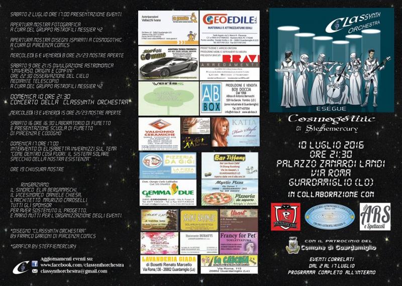L'ensemble eseguirà dal vivo Cosmogothic di Steffiemercury: un concept album strumentale il cui tema è un viaggio nella nostra Galassia, partendo dal Sole, attraverso tutti i pianeti, rispecchiandone con la musica il carattere astronomico e mitologico. Nella settimana precedente e in quella successiva si susseguiranno eventi collegati a tema con l'argomento, come potete leggere nel materiale informativo di cui allego i link