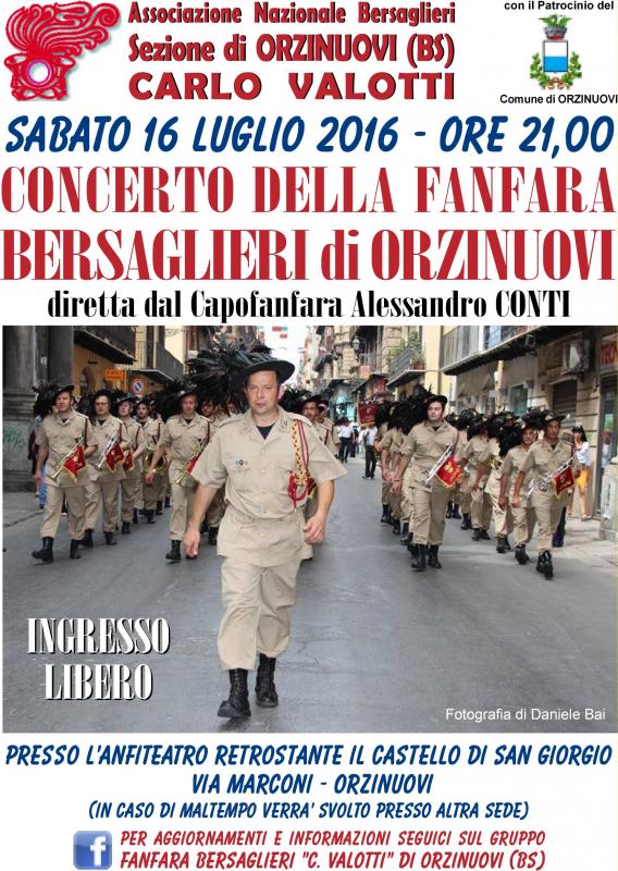 Sabato 16 Luglio 2016, alle ore 21 presso la splendida cornice dell'anfiteatro del Castello di Orzinuovi (BS) si terrà il Concerto della Fanfara Bersaglieri di Orzinuovi.
