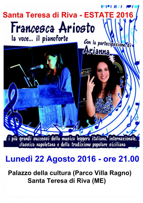 "Francesca Ariosto: la voce ..... il pianoforte" (con la partecipazione straordinaria di Arianna), è il titolo dello spettacolo che è stato organizzato dal Comune di Santa Teresa di Riva, nell’ambito del calendario delle manifestazioni “ESTATE 2016”.