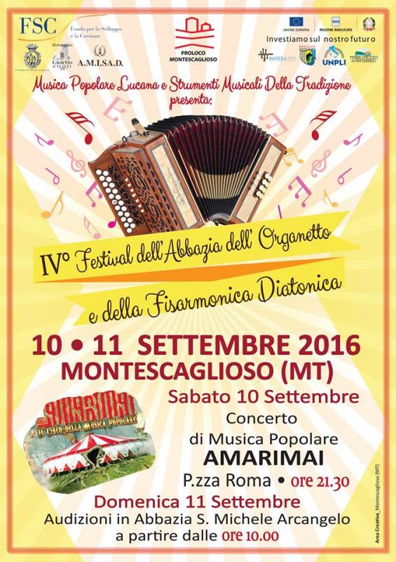 La Proloco Montescaglioso in collaborazione con l’A.M.I.S.A.D. (Associazione Musicale Italiana Strumenti ad Ancia Diatonici) di Maiolati Spontini (AN) e dell'Ass.ne Musicale “Amici della Musica” di San Benedetto del Tronto (AP), organizza nelle giornate del 10 e 11 settembre il IV Festival dell’Abbazia dell’Organetto e della Fisarmonica Diatonica.
