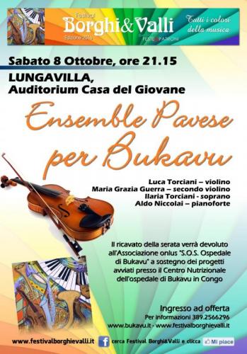 Sabato 8 Ottobre torna, in Auditorium “Casa del Giovane” a Lungavilla, l’annuale concerto organizzato da Associazione Porana eventi nell’ambito del Festival Borghi&Valli a favore della onlus pavese S.O.S. Ospedale Bukavu. Sul palcoscenico, a partire dalle 21,15, ci saranno i componenti dell’Ensemble Pavese, ovvero i violinisti Luca Torciani e Maria Grazia Guerra, il soprano Ilaria Torciani ed il pianista Aldo Niccolai. Una serata che spazierà da brani celebri di opera ed operetta, fino alle colonne sonore da film e alle melodie napoletane. L’associazione S.O.S. Ospedale di Bukavu è nata nel 2002 per raccogliere fondi da destinare ai bimbi del Centro Nutrizionale S. Giuseppe di Bukavu, in Congo.