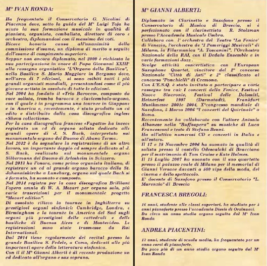 A contorno della manifestazione ci saranno anche due giovani promettenti allievi della rinomata scuola d’organo del M° IvanRonda : Francesca Bregoli, 16 anni, e Andrea Piacentini, 13 anni.