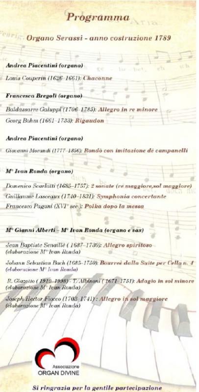 Il pregevole organo Serassi della chiesa, costruito nel 1789, sarà suonato dal famoso Maestro Ivan Ronda, conosciuto anche per le numerose tournee internazionali e per i numerosi CD registrati dal vivo con i più importanti organi Europei.