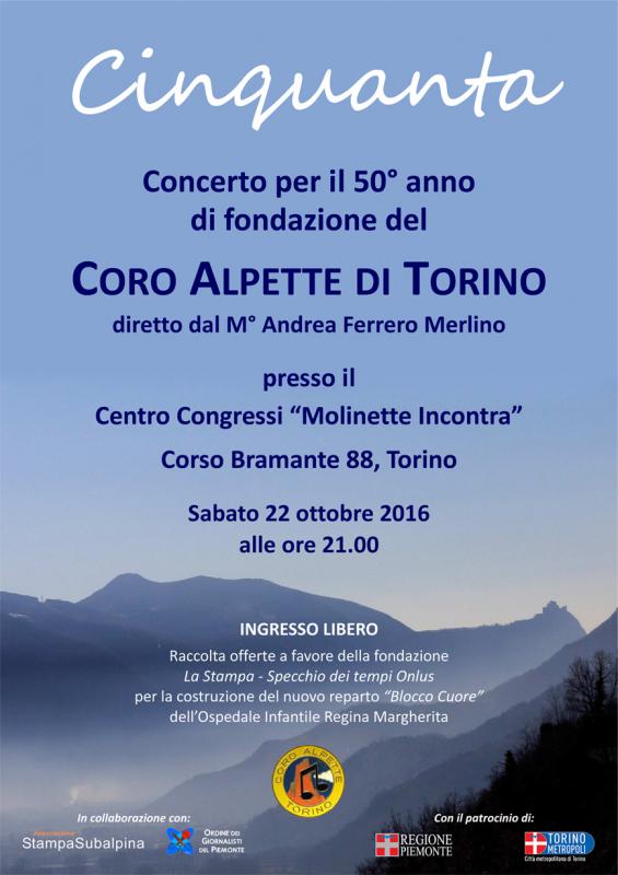 Sabato 22 ottobre alle ore 21:00 presso il Centro Congressi "Molinette Incontra" in corso Bramante 88 a Torino,si terrà il concerto "Cinquanta" per celebrare i 50 anni di attività del Coro Alpette di Torino, durante il quale verranno ripercorsi i momenti, musicali e no, della storia del coro.