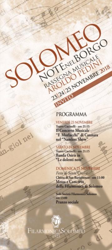 La rassegna si concluderà domenica 25 novembre con la Festa di Santa Cecilia presso la Chiesa di San Bartolomeo alle ore 11.00, con la Santa Messa e il Concerto della Filarmonica di Solomeo, diretti dal Maestro Francesco Verzieri. Una banda composta di circa 40 elementi con un repertorio che spazia dalla musica classica, al jazz, al blues. La festa proseguirà poi presso la Sede Sociale della Filarmonica di Solomeo con il pranzo sociale.