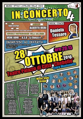 Venerdì 28 ottobre 2016, al Teatro Osvaldo Chebello di Cairo Montenotte dalle ore 20.15, si svolgerà il concerto della scuola di canto Music Style l'Atelier delle Voci. Sul palco ci saranno gli allievi del soprano Daniela Tessore.
