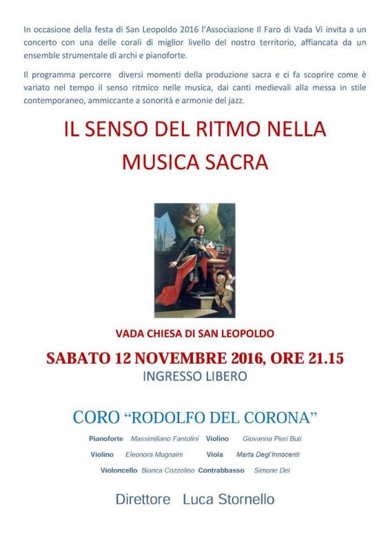 In occasione della Festa di San Leopoldo 2016 l'Associazione Il Faro di Vada Vi invita a un concerto con una delle corali di miglior livello del nostro territorio, affiancata da un ensemble strumentale di archi e pianoforte.