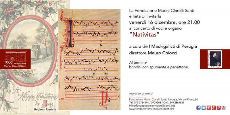 La Fondazione Marini Clarelli Santi è lieta di invitarla venerdì 16 dicembre ore 21:00 al concerto di voci e organo "Nativitas" a cura de i Madrigalisti di Perugia e il direttore Mauro Chiocchi.