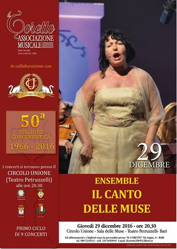 GIOVEDI 29 DICEMBRE 2016 ALLE ORE 21,00 PRESSO LA SALA DELLE MUSE DEL CIRCOLO UNIONE DI BARI PER LA 50a STAGIONE CONCERTISTICA DELLA STORICA ASSOCIAZIONE MUSICALE IL CORETTO DI BARI, ENSEMBLE "IL CANTO DELLE MUSE", VOCE A ......PERDIFIATI PER SOPRANO E QUINTETTO DI FIATI , MUSICHE DI ROSSINI, DONIZETTI, PUCCINI, VERDI, BIZET MORRICONE, ROTA ECC.