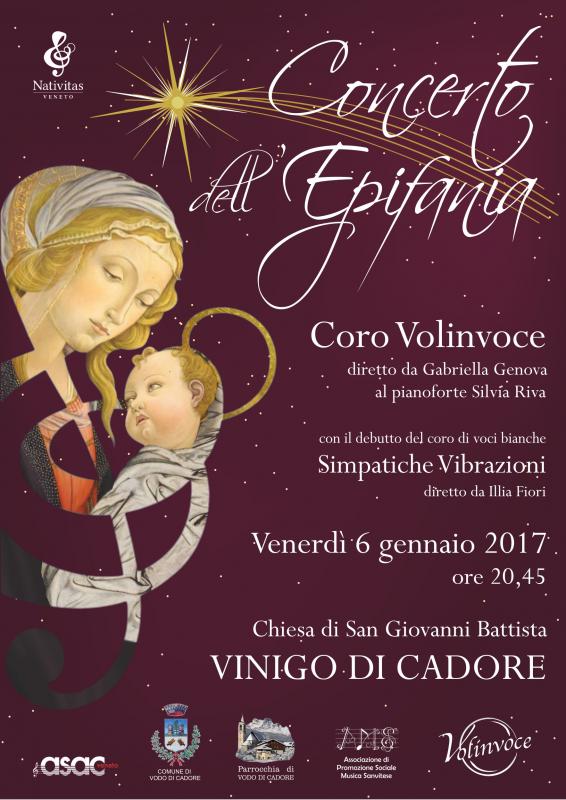 Il Coro Volinvoce di Pieve di Cadore diretto dalla maestra Gabriella Genova, dopo le esibizioni a Canale d’Agordo e Calalzo di Cadore, chiude la rassegna di appuntamenti natalizi con un concerto venerdi 6 gennaio 2017 nella bellissima Chiesa di San Giovanni Battista a Vinigo di Vodo di Cadore.