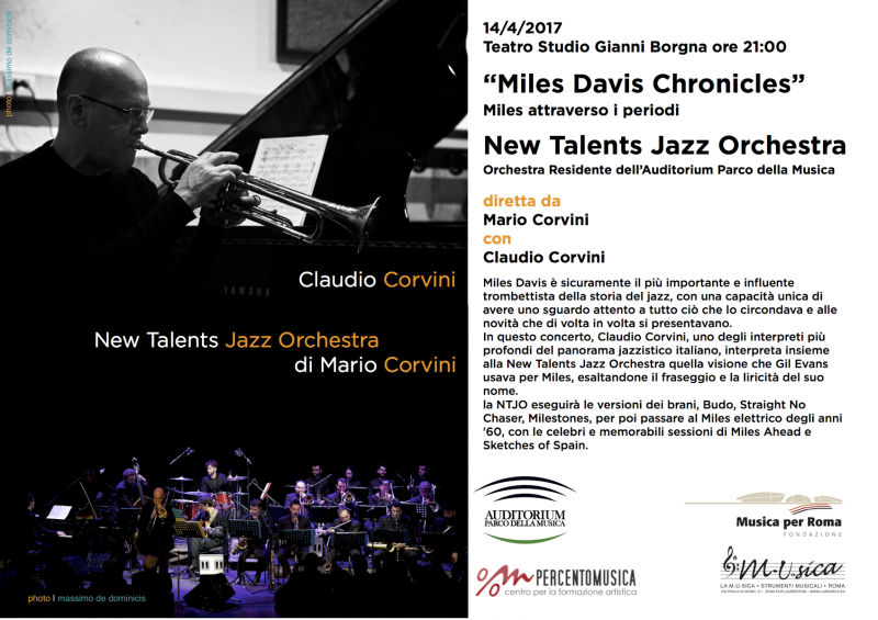 Dopo il grande successo dei primi due concerti della rassegna "Incontri in Jazz", con protagonista la New Talents Jazz Orchestra - Orchestra Residente dell'Auditorium Parco della Musica di Roma - diretta da Mario Corvini, venerdì 14 aprile al Teatro Studio dell'Auditorium si terrà il terzo appuntamento: l'omaggio a Miles Davis "Miles Chronicles" che avrà come special guest il trombettista Claudio Corvini. Miles Davis è stato sicuramente il più importante e influente musicista della storia del jazz, dotato di uno sguardo attento a tutto ciò che lo circondava e alle novità che di volta in volta si presentavano. In questo concerto, Claudio Corvini interpreterà insieme alla New Talents Jazz Orchestra quella visione che Gil Evans usava per Miles, esaltandone il fraseggio e la liricità. Dai brani “Budo”, “Straight No Chaser”, “La Nevada Blues”, “Milestones”, per poi passare al Miles elettrico degli anni '60, e le celebri e memorabili sessioni di “Miles Ahead” e “Sketches of Spain”.