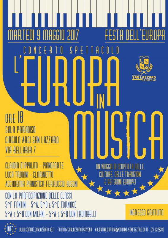 Martedì 9 maggio si celebra la Festa dell'Europa e sarà l'occasione per assistere al concerto spettacolo Europa in Musica, atto finale del progetto per le scuole primarie organizzato dal Comune di San Lazzaro con l'Accademia pianistica internazionale "Ferruccio Busoni".
