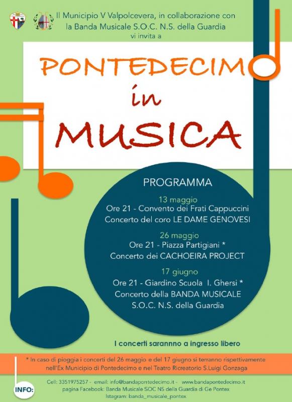 Il Municipio V Valpolcevera, in collaborazione con la Banda Musicale S.O.C. Nostra Signora della Guardia di Pontedecimo accoglierà la Primavera 2017 con un nuovo appuntamento: “PONTEDECIMO IN MUSICA”.
