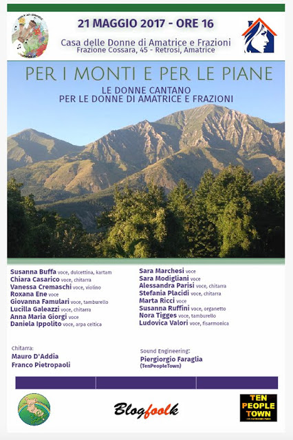 Le voci femminili del folk italiano si riuniscono per portare musica alle donne e alla popolazione del cratere sismico, in un concerto di riconciliazione con la natura e il territorio attraverso i canti della tradizione popolare. Il concerto, preview della seconda edizione del "Festival delle Ciaramelle" che si terrà ad Amatrice dal 4 al 6 agosto, è ospitato dalla Casa delle Donne di Amatrice e Frazioni. Sotto questo nome si riuniscono donne di tutte le generazioni residenti nell'area del sisma o legate a quei luoghi, che da mesi lavorano intensamente per instaurare una rete sociale tra le donne, creare un polo multifunzionale in cui convivano tradizioni artigianali e nuove tecnologie, permettere la ripartenza delle microeconomie e di tutte le attività artigianali tipiche. La presenza delle artiste, che si esibiranno in forma totalmente gratuita, è un segno di profonda solidarietà, sostegno e vicinanza nei confronti di tutte le donne presenti nelle quattro regioni colpite dal sisma e in memoria di quelle scomparse il 24 agosto scorso.